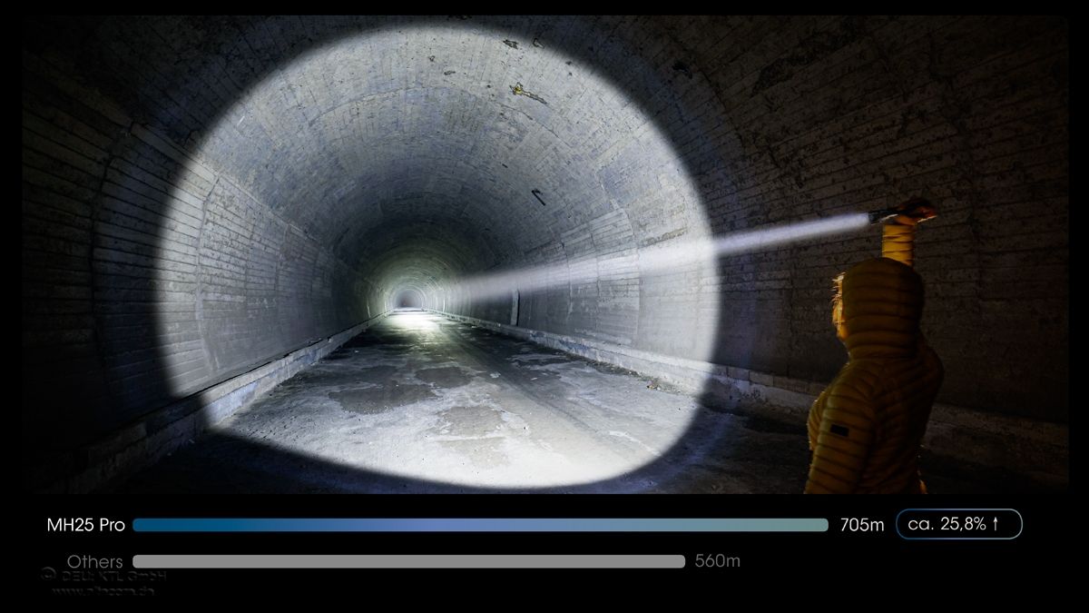 Die Leistungsdaten der MH25 Pro sind beeindruckend und konkurrenzlos bezogen auf die Baugröße der Lampe: 3300 Lumen Leuchtstärke, 705 Meter Leuchtweite, USB-C-Aufladung, 5300mAh Akku.