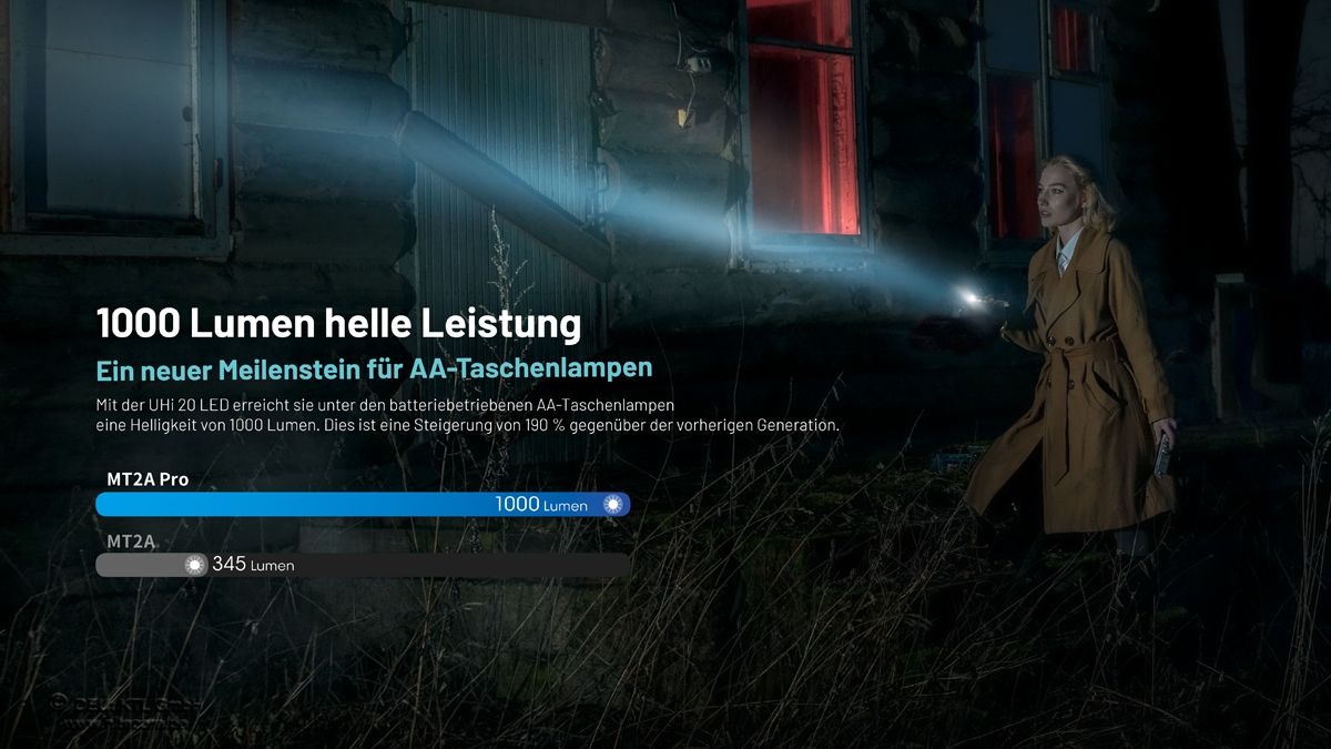 Der zum Lieferumfang gehörende NL1416R Li-Ion Akku kann auch gegen 2 Stück AA-Batterien ausgetauscht werden. Die MT2A Pro leistet dann noch 500 Lumen.