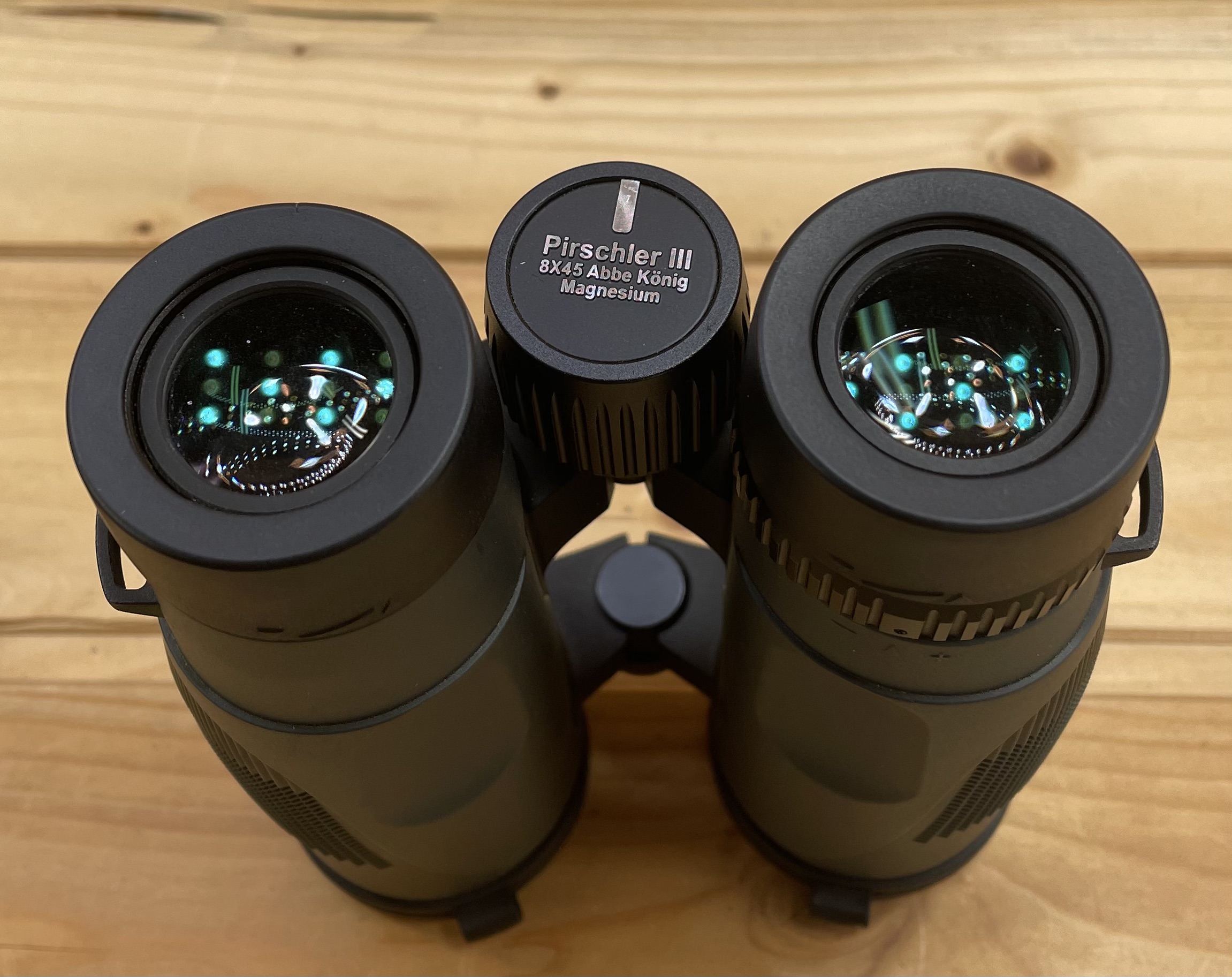 An dem neuen „Pirschler“-Fernglas findet sich (die Stativschutzkappe und Armierung ausgenommen) kein Gramm Kunststoff, weder am Körper selbst, noch an Verschleißteilen. Körper und Brücke sind aus einer ultraharten aber extrem leichten Magnesiumlegierung aus dem Flugzeugbau und machen das Fernglas nahezu unzerbrechlich. Der Diopter (Verstellbereich +-4) befindet sich wegen der besseren Funktionalität nicht mehr am Fokussierrad, sondern am rechten Okular . All diese Bedienungselemente – Diopter, Okular , Fokussierend – bestehen aus Duraluminium und sind damit Garant für eine große Langzeitbelastung. Eine sogenannte „Best Grip“- Armierung an der Außenseite des Körpers verhindert ein Abrutschen der Hände. Damit wird das einhändige Greifen und Halten dieses kompakten Fernglases auch mit Handschuhen angenehm komfortabel und sicher.